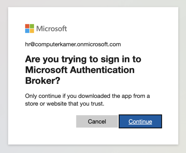 - After login user receives a form asking: “Are you trying to sign in to Microsoft Authentication Broker?”.