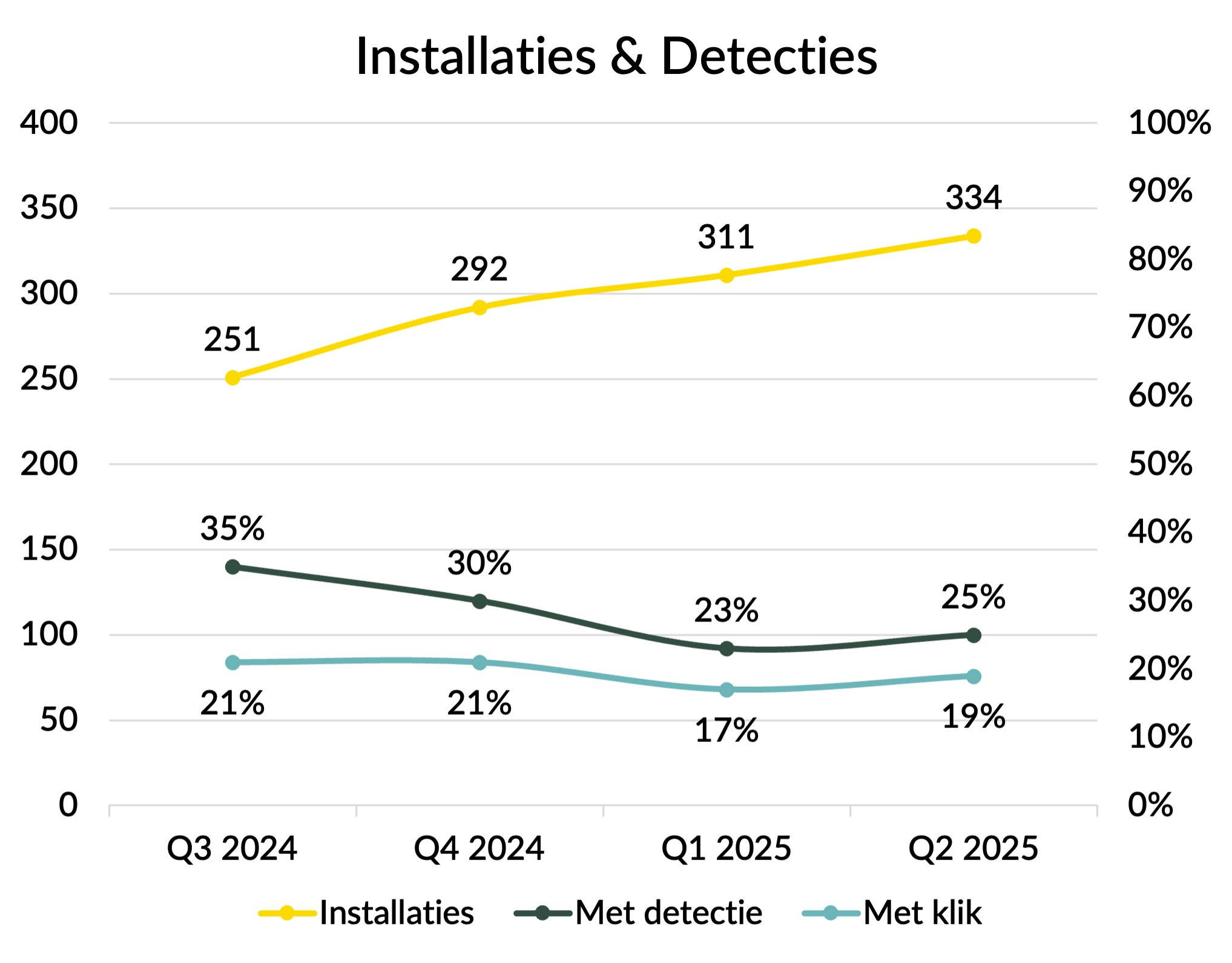 Door de rapportperiode heen nam het aantal installaties toe. We hebben per maand en kwartaal terug gerekend bij hoeveel op dat moment aangesloten bedrijven een detectie plaatsvond.