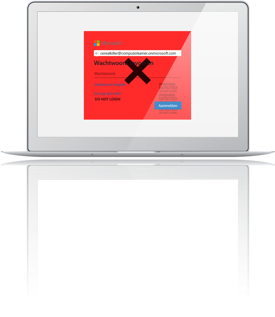 - Interventie bij de login: onze slimme detectiedienst toont een rood waarschuwingsscherm zodra een nep-inlogpagina gedetecteerd wordt. Dit is beschikbaar als gratis dienst én als onderdeel van Attic Bouncer.