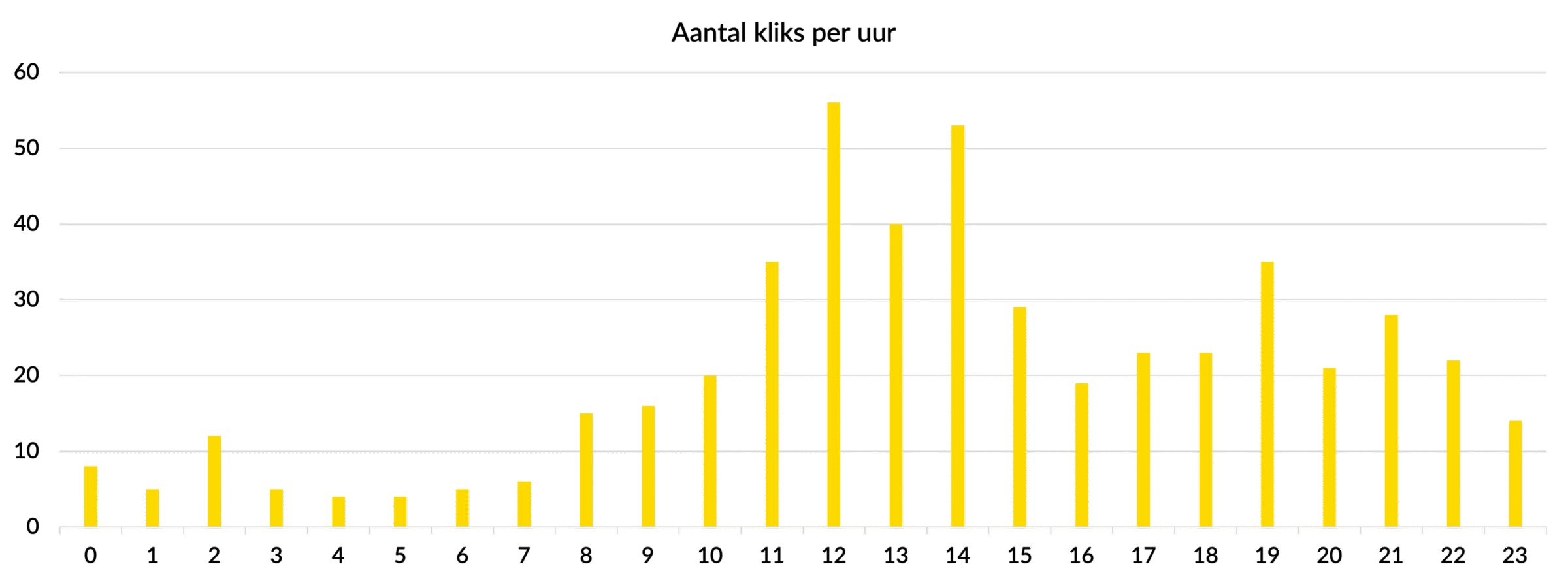 Klikken piekt op dinsdag rond lunchtijd. 32% van alle kliks was op de dinsdag, en 30% tussen 12:00 en 15:00.