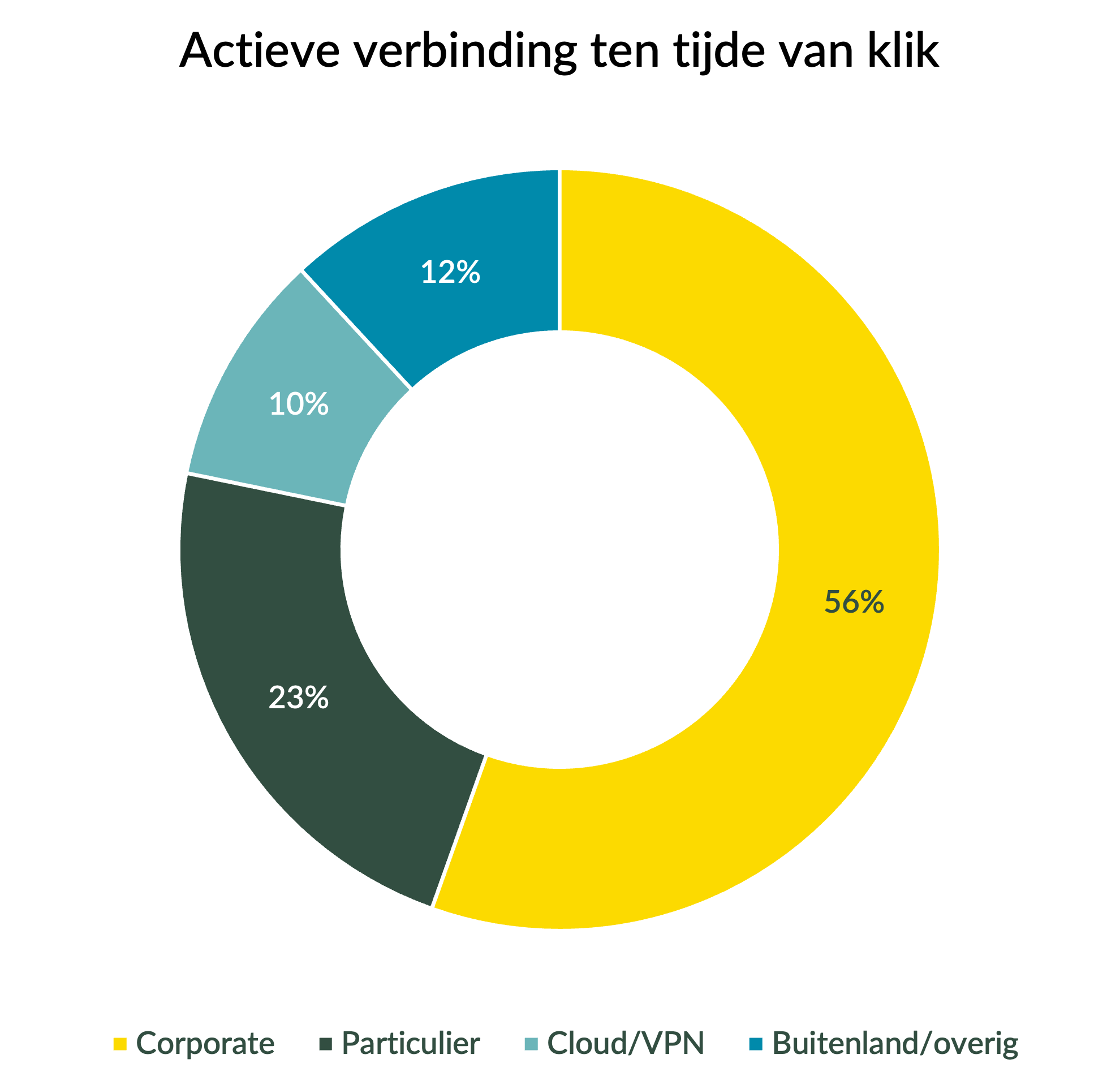 In Nederland komt 44% van de kliks tot stand wanneer het slachtoffer niet verbonden is met een bedrijfsnetwerk (waarvan 23% via particuliere/mobiele verbindingen). Dit betekent dat de medewerker niet beschermd wordt door de netwerkbeveiliging van het werk. Dus bescherming moet veel meer gericht worden rondom de identiteit van de medewerker: inloggen is vaak de enige barrière voor toegang tot gevoelige data.