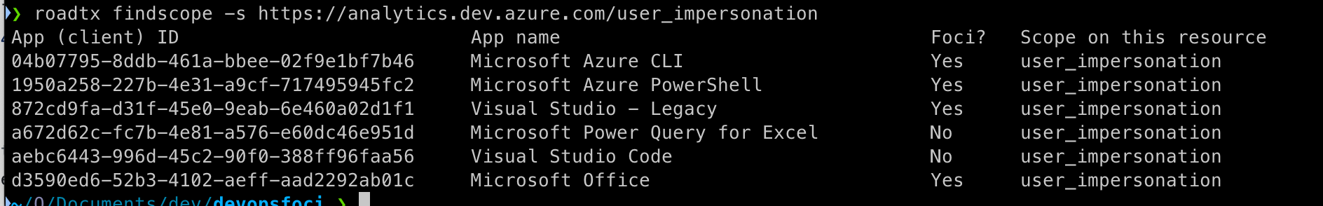 The client IDs that have access to the DevOps resource have been submitted to Roadtx. Additionally, Dirk-Jan has identified more client IDs. Roadtx can now be used to determine which clients can provide access to the resource: