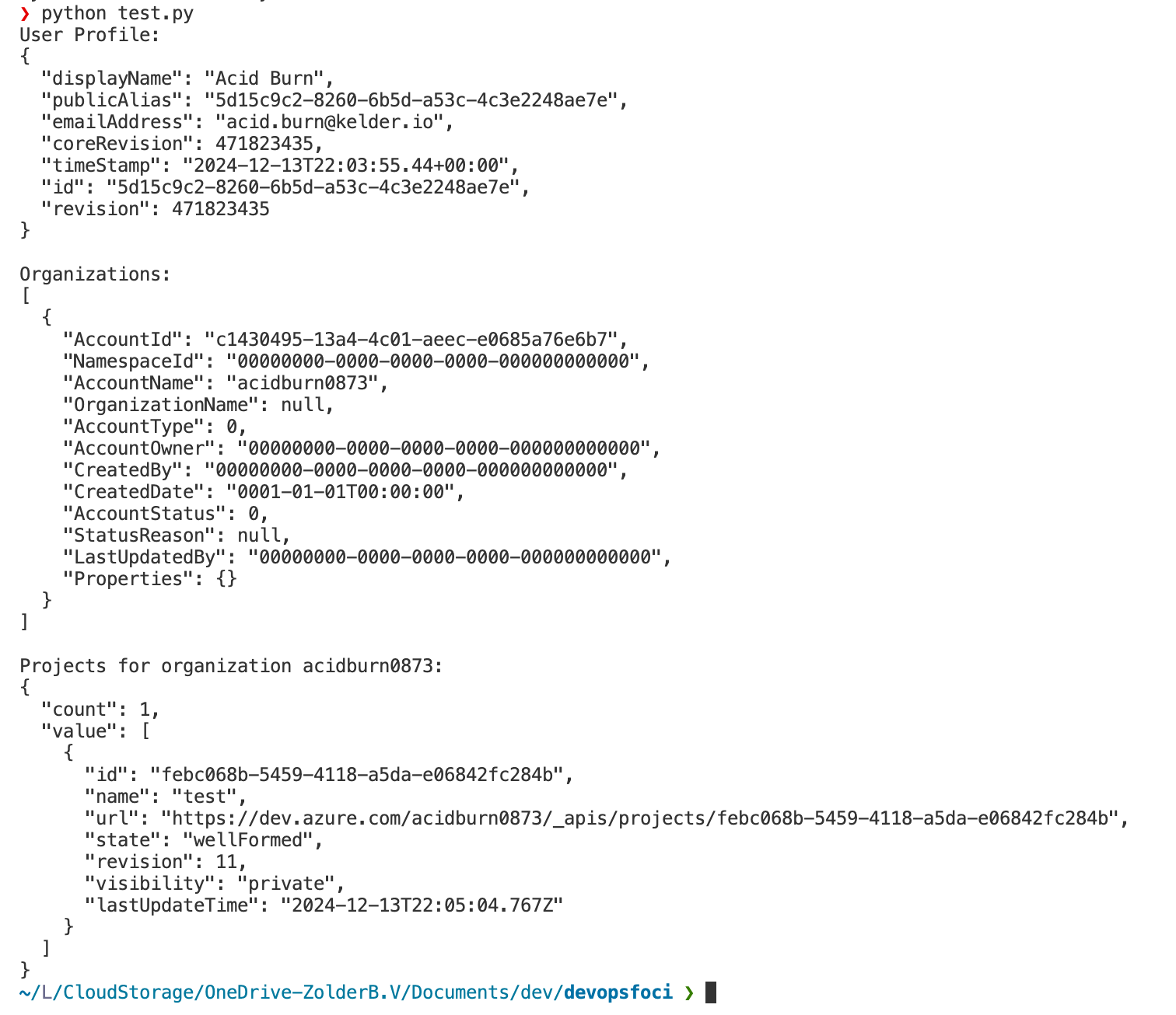 We were curious if, and which, FOCI client would give access to the DevOps resource. To investigate, we figured it would be a good start to take a list of client IDs, authenticate to them, and request access to the Azure DevOps resource. We used the Secureworks CSV of FOCI clients for this purpose. That way, we could pivot from Outlook or Teams refresh tokens to DevOps.
