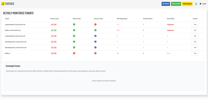 The MFA Posture Overview gives you a bird's-eye view of the MFA health across all your monitored Microsoft 365 tenants. Use this page to quickly identify which tenants need attention and where the biggest security gaps are.